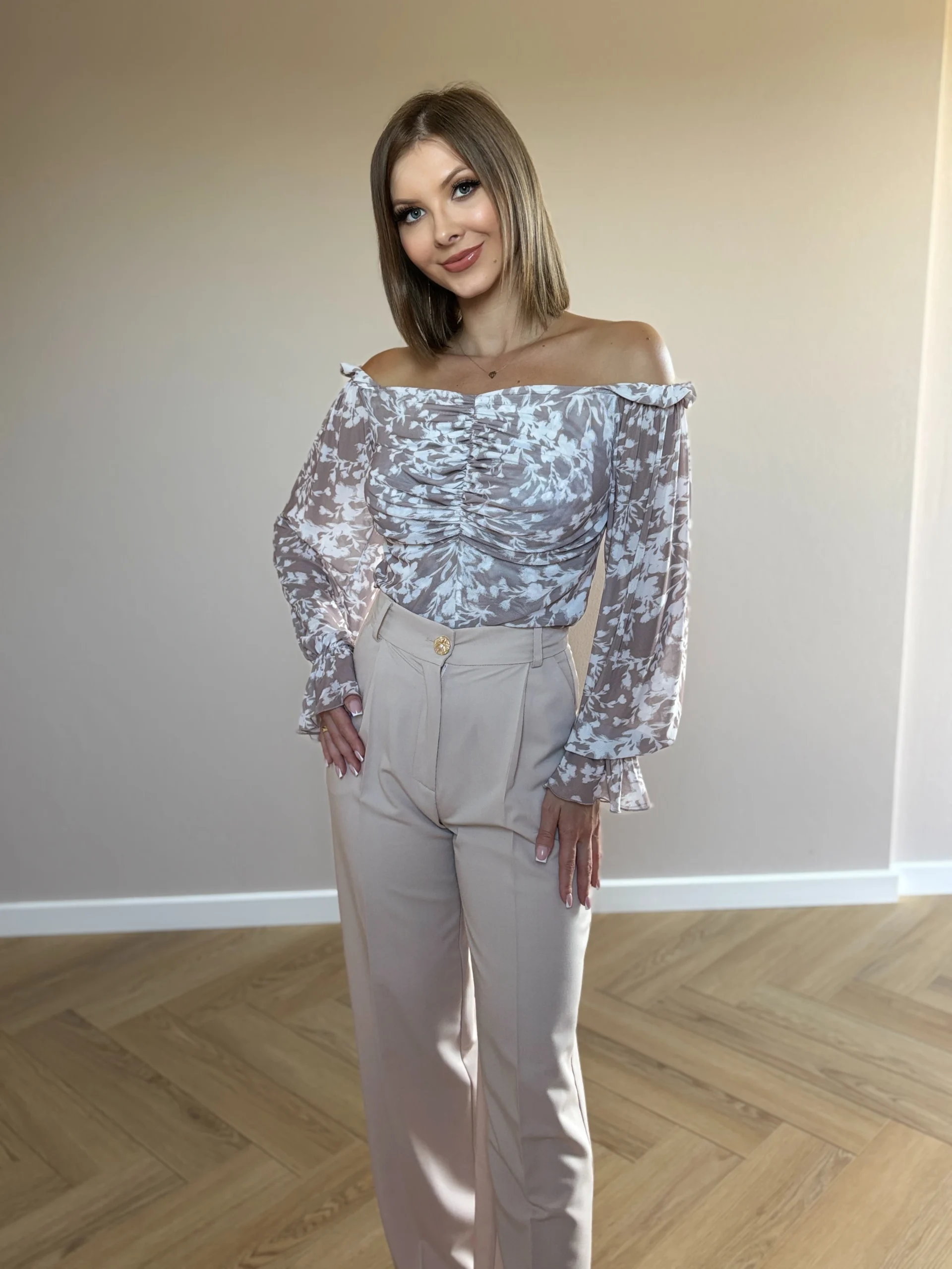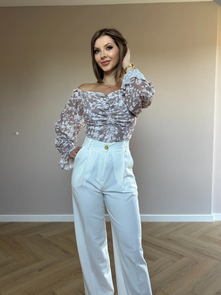 Niezwykle kobieca bluzka to idealny wybór na letnie dni i wieczorne wyjścia. Wykonana z lekkiego, przewiewnego materiału, zachwyca eleganckim kwiatowym printem w odcieniach kremowego i beżu. Fason off-shoulder pięknie eksponuje ramiona, a marszczenie na przodzie subtelnie podkreśla sylwetkę. Długie, bufiaste rękawy zakończone delikatnymi falbanami dodają romantycznego charakteru.