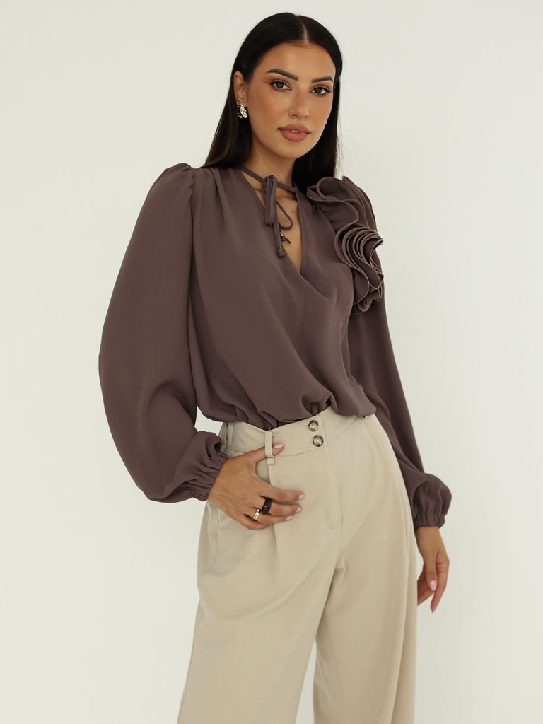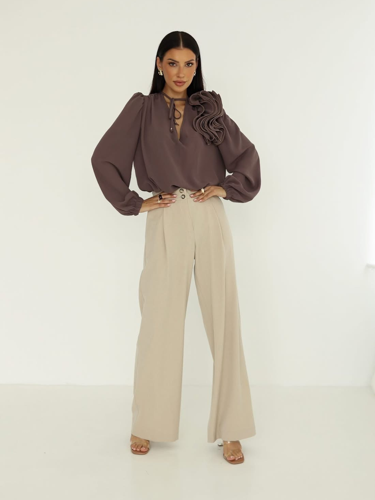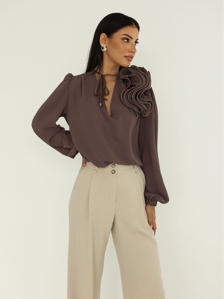 Elegancka bluzka damska Rose to połączenie kobiecego stylu i subtelnej lekkości. Wyróżnia się dekoracyjnym kwiatem na ramieniu, który dodaje niepowtarzalnego uroku, oraz delikatnym wiązaniem przy szyi. Wykonana z lekkiego, zwiewnego materiału, zapewnia komfort noszenia i pięknie układa się na sylwetce. Idealna zarówno na specjalne okazje, jak i eleganckie stylizacje na co dzień. Doskonała w połączeniu ze spódnicą lub eleganckimi spodniami.