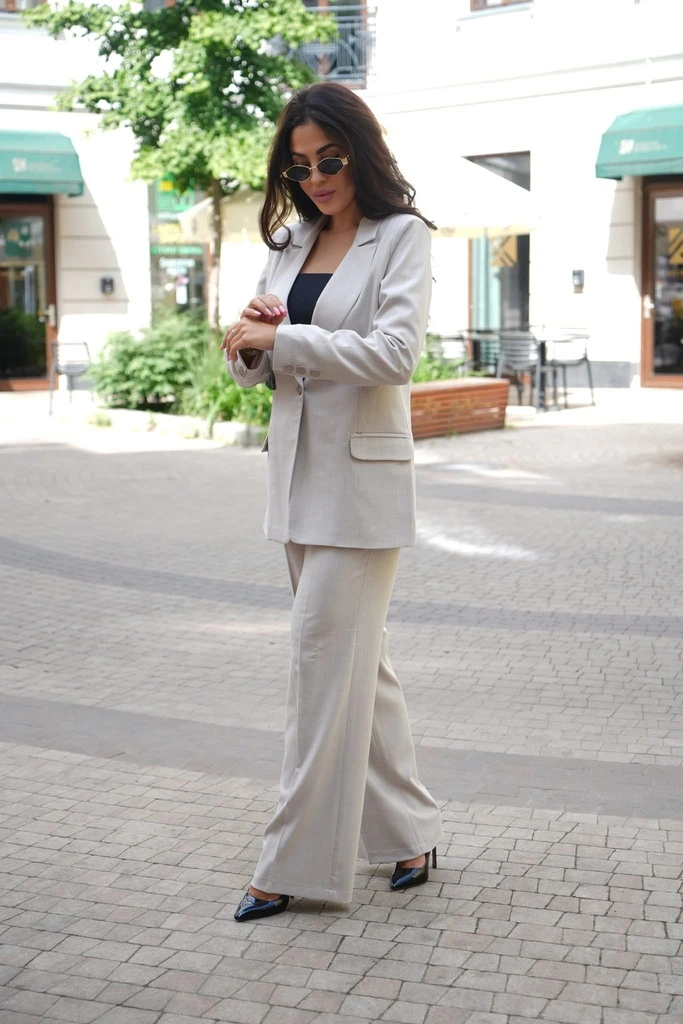 Damski garnitur w odcieniu beżu to idealny wybór zarówno na co dzień, jak i na wyjątkowe okazje. Subtelny kolor, perfekcyjny krój i wysoka jakość wykonania sprawiają, że komplet doskonale wpisuje się w aktualne trendy mody. Marynarka o lekko dopasowanym fasonie pięknie modeluje sylwetkę, a szerokie spodnie zapewniają wygodę i swobodę ruchów. Całość tworzy uniwersalny outfit, który świetnie sprawdzi się w stylizacjach biznesowych, casualowych oraz eleganckich.