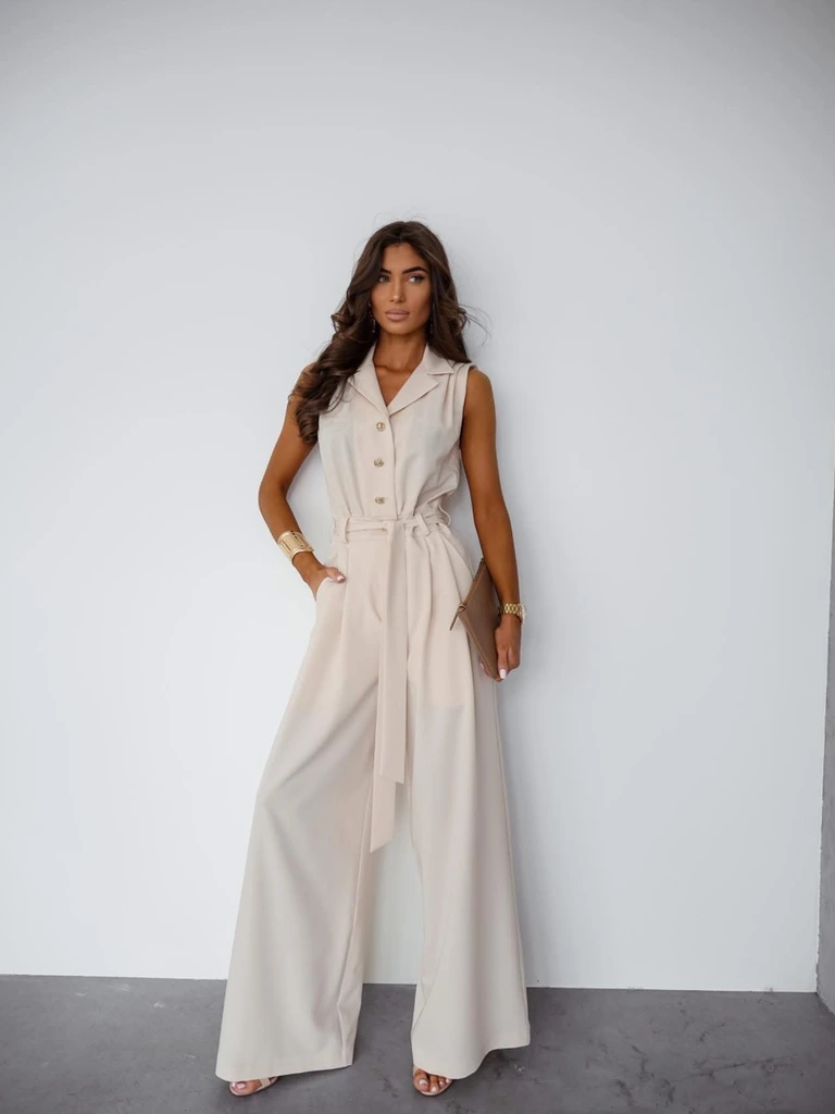 Elegancki beżowy kombinezon to must-have w każdej kobiecej garderobie. Klasyczny kołnierzyk, guziki z przodu i wiązanie w talii, pięknie podkreślają sylwetkę, a szerokie nogawki dodają lekkości i szyku. Idealny na spotkania, do pracy czy wieczorne wyjście- zawsze wygląda stylowo i z klasą.