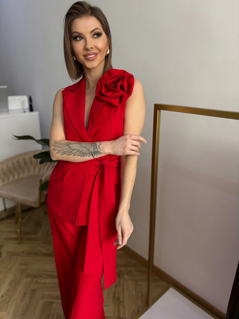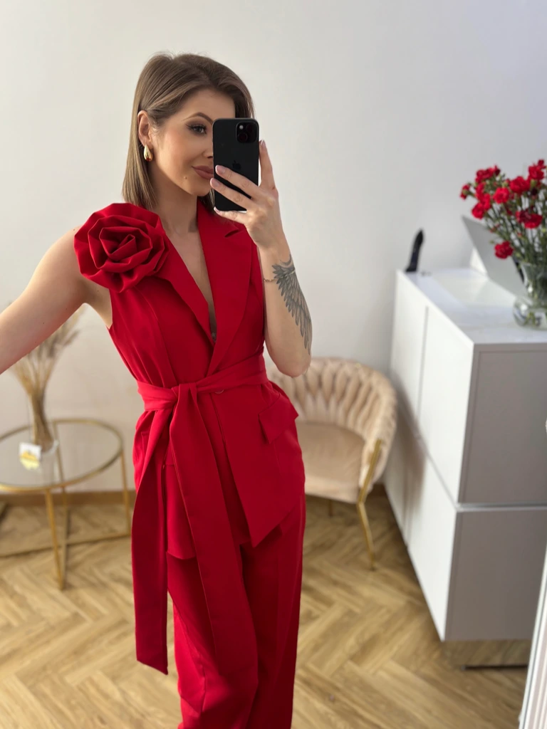 Elegancki Komplet Czerwony Damski z Różą – Kamizelka i Spodnie
