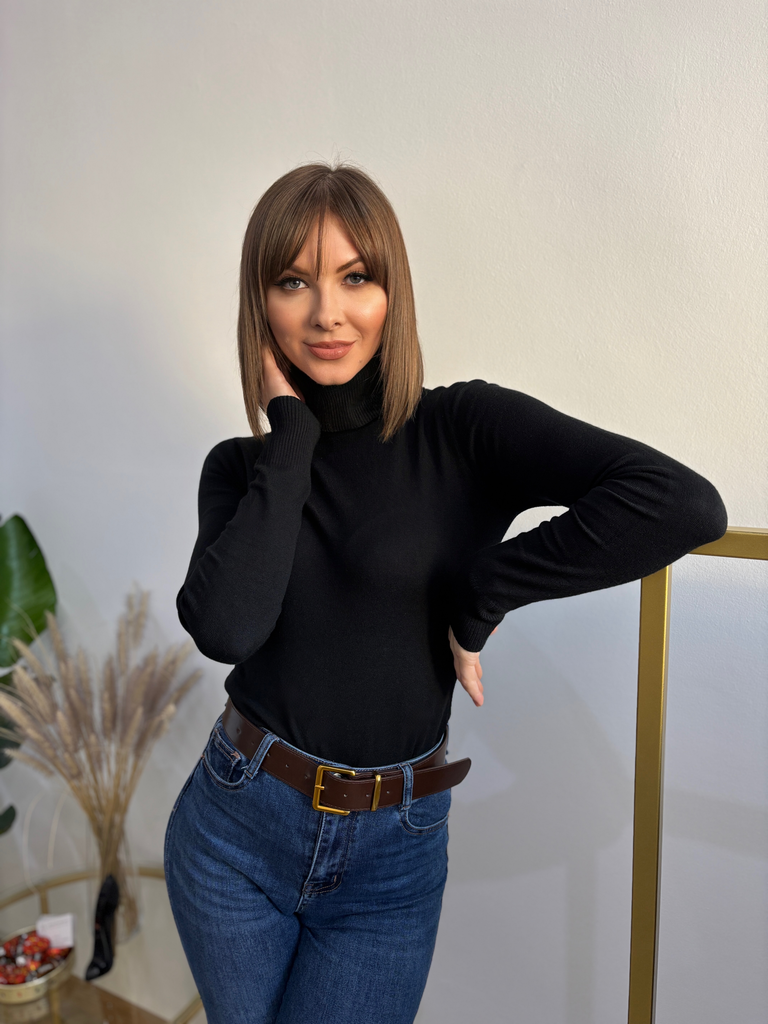 Ten czarny golf to uniwersalna baza każdej stylizacji – pasuje do wszystkiego i sprawdzi się o każdej porze roku. Jeśli szukasz ubrania, które łączy elegancję, wygodę i ponadczasowy styl – ten model będzie strzałem w dziesiątkę!