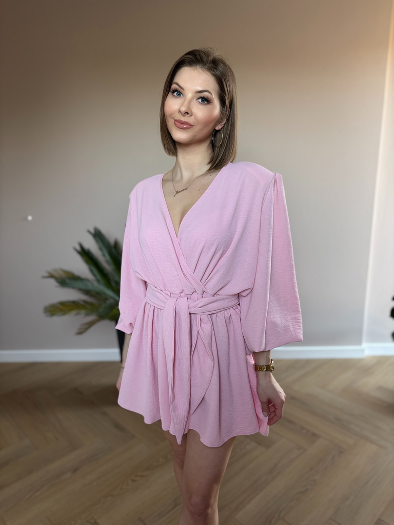 Stylowy i kobiecy kombinezon w odcieniu pudrowego różu to doskonały wybór na wiosenne i letnie dni. Wykonany z lekkiego, przyjemnego w dotyku materiału, zapewnia komfort noszenia i swobodę ruchów. Luźny krój z delikatnie rozszerzonymi rękawami nadaje sylwetce lekkości, a wiązanie w talii pięknie ją podkreśla, modelując figurę.