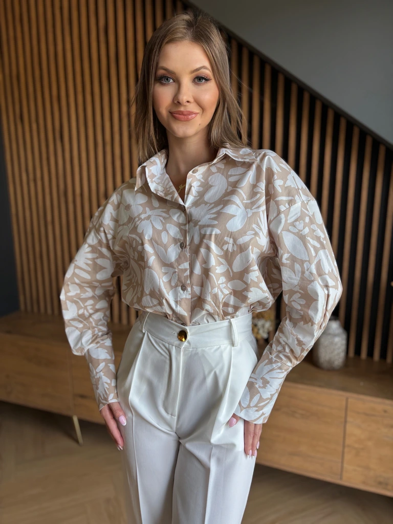 Elegancka i lekka koszula oversize z wiskozy, idealna do codziennych i bardziej stylowych stylizacji. Luźny fason zapewnia komfort i swobodę ruchów. Modny kwiatowy print w beżowo-białej kolorystyce doda charakteru każdej stylizacji.