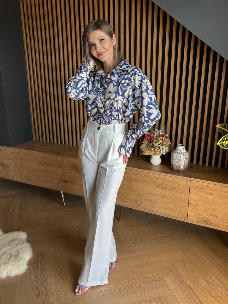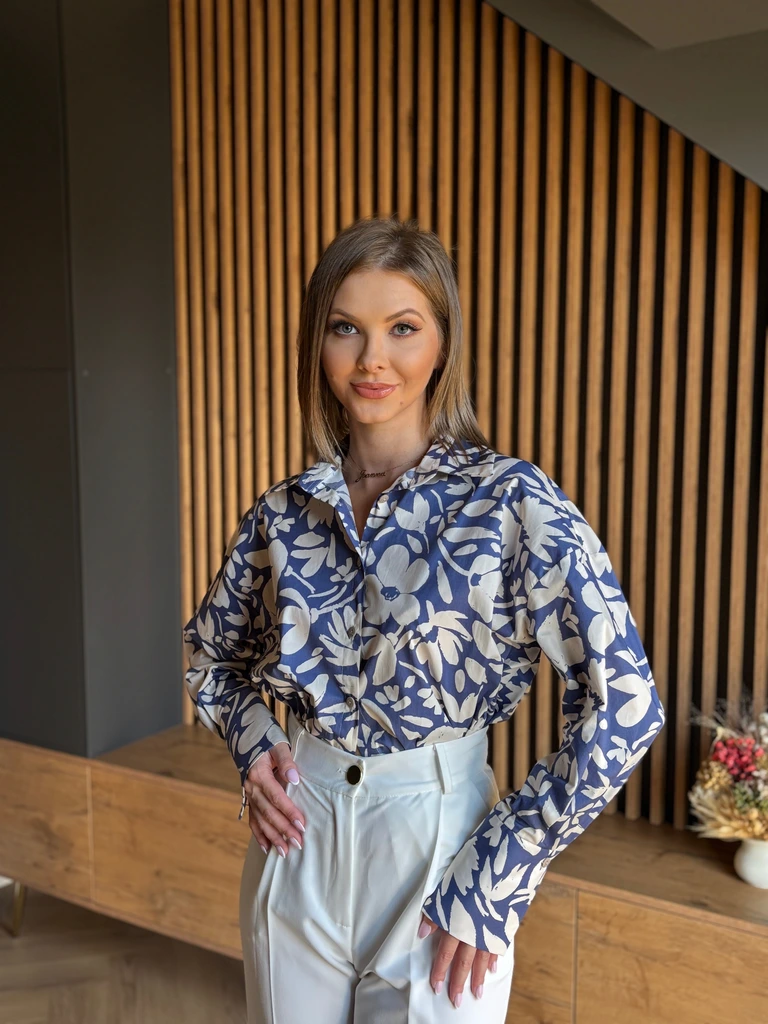 Elegancka i lekka koszula oversize z wiskozy, idealna do codziennych i bardziej stylowych stylizacji. Luźny fason zapewnia komfort i swobodę ruchów. Modny kwiatowy print w granatowo-kremowej kolorystyce doda charakteru każdej stylizacji.