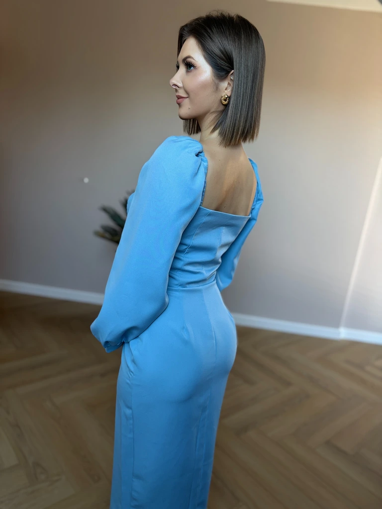 Elegancka sukienka w odcieniu pastelowego błękitu o dopasowanym kroju, podkreślającym sylwetkę. Posiada efektowny dekolt w kształcie serca, bufiaste rękawy o długości 3/4 oraz rząd ozdobnych guzików wzdłuż przodu. Rozcięcie na dole dodaje kobiecości, a materiał prezentuje niezwykle stylowo i szykownie. Idealna na wyjątkowe okazje