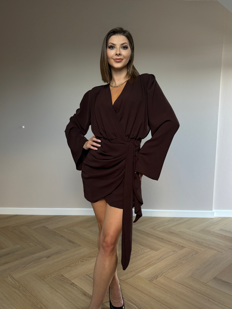 Podkreśl swoją kobiecość z klasą! Ta stylowa sukienka kopertowa w odcieniu głębokiego brązu to idealne połączenie elegancji i nowoczesności. Drapowany krój pięknie układa się na sylwetce, a pasek w talii podkreśla figurę. Długie rękawy i asymetryczna długość dodają charakteru. Doskonała na wieczorne wyjścia, randki czy stylowe spotkania.