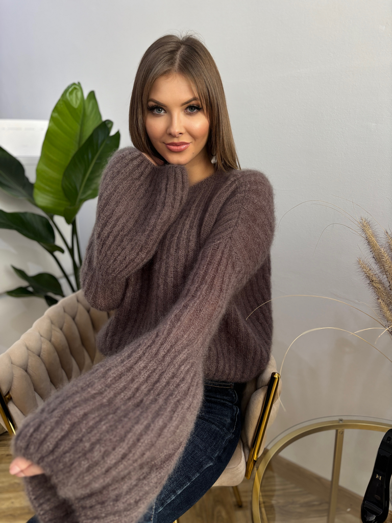 Sweter moher z szerokimi rękawami w odcieniu brązu to kwintesencja subtelnej elegancji i kobiecego stylu. Jego puszysta faktura i luźny krój dodają lekkości, a szerokie rękawy podkreślają unikalny design. Idealny na chłodniejsze dni, gdy chcesz czuć się komfortowo, a jednocześnie wyglądać stylowo. Produkt polski.
