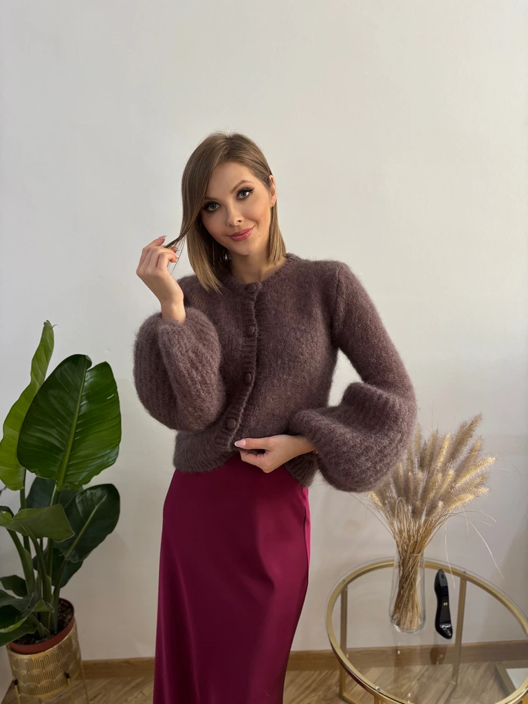 Luksusowy sweter z miękkiej przędzy moherowej, który zachwyca swoją puszystą fakturą i eleganckim wykończeniem. Klasyczny fason urozmaicony został bufiastymi rękawami i zapięciem na guziki, dzięki czemu sweter świetnie sprawdzi się zarówno w roli kardiganu, jak i noszony solo. Subtelny brązowy odcień nadaje mu ponadczasowego charakteru i łatwo łączy się z innymi elementami garderoby. Idealny wybór na chłodniejsze dni – do biura, na spotkania czy wieczorne wyjścia.